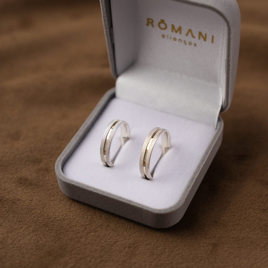 A Prata 925 ou o Ouro Branco trazem uma contemporaneidade ao tradicional, com um toque de elegância. O ouro branco representa o amor puro, enquanto o rosé é associado à paixão. As alianças em Prata 925 da Romani são ideais para casais que buscam algo diferenciado, mantendo a essência do amor duradouro.